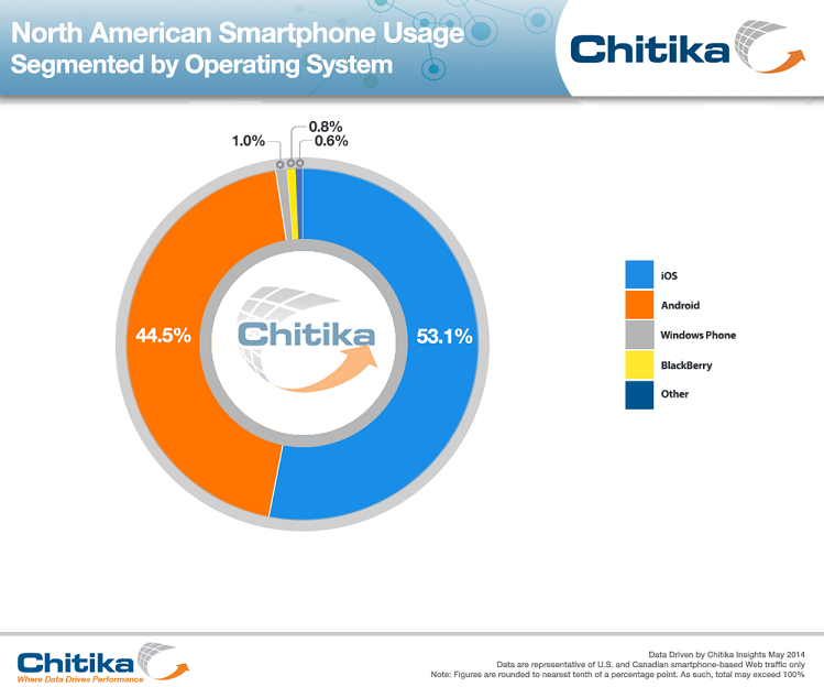 According to a new report from Chitika, an online advertising network, Apple’s iOS operating system continues to dominate web traffic in North America (USA and Canada) at 53.1 percent. Android came second with 44.5 percent follow by Windows Phone – 1.0 percent, Blackberry – 0.8 percent and Other – 0.6 percent.