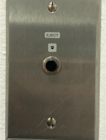 Around 10 or 11 that night I was wandering around waiting for a build to finish when I happened to pass by that mysterious button near the bathrooms. I looked around, and was alone in the hallway. I carefully peeled off a couple of the CDROM stickers and placed the “Eject” sticky and one of the arrows over the button….